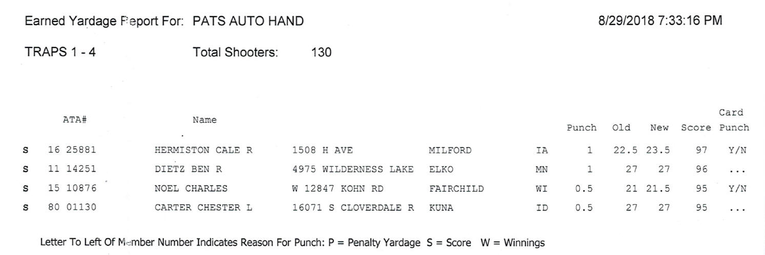 WEDNESDAY 8/29/2018 EARNED YARDAGE