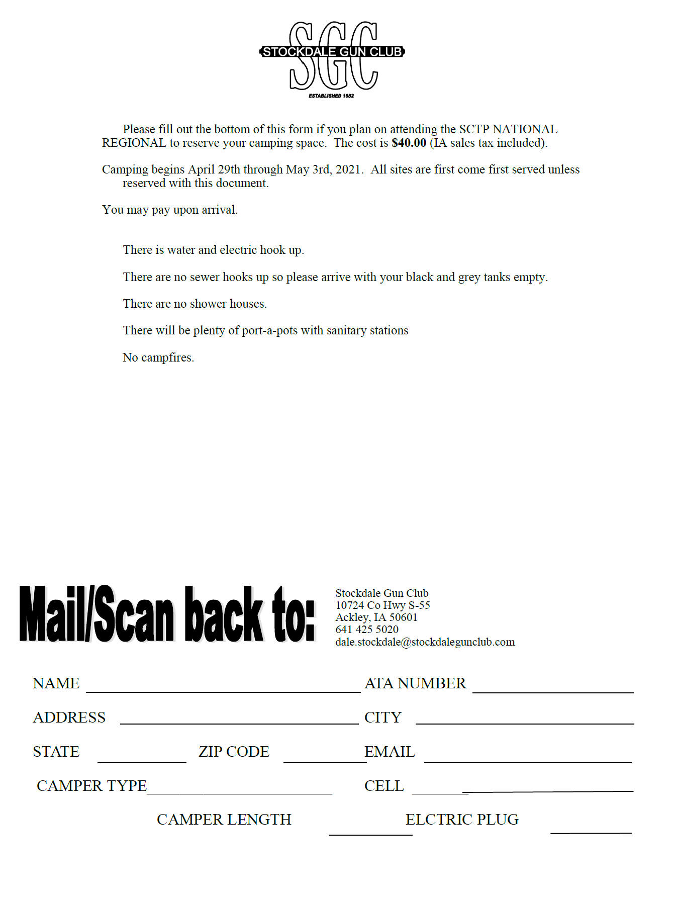 | 2021 | CAMPING FOR SCTP REGIONAL SHOOT | SCTP NATIONAL REGIONAL | DATE | 4/26/2021 | Pets and ATV - golf carts welcome | |||||||||||